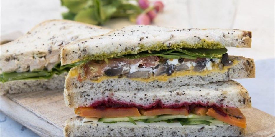 Gluten Free Lunch Box contains1 x Gluten free gourmet sandwich gf1 x Vegetarian rice paper roll w. sweet chili sauce 1 x Fresh fruit skewer