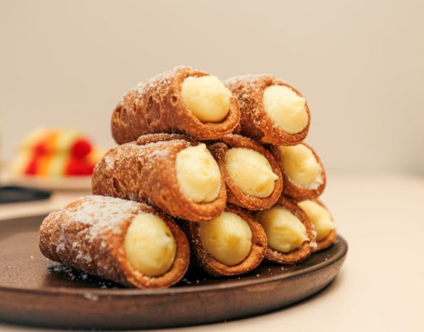Each Box Contains:1 x Rustic olive focaccia 2 x Mini vanilla custard cannoli1 x Fresh fruit skewer